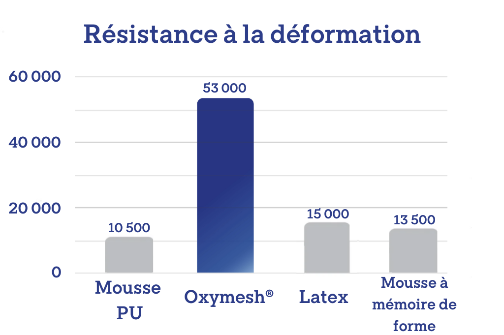 Dans les tests de résistance, l’Oxymesh® a atteint un résultat impressionnant de 53 000 cycles avant l’apparition d’une déformation significative. C'est 5 fois plus que la mousse polyuréthane standard (10 500 cycles) et presque 4 fois plus que la mousse à mémoire de forme (13 500 cycles).