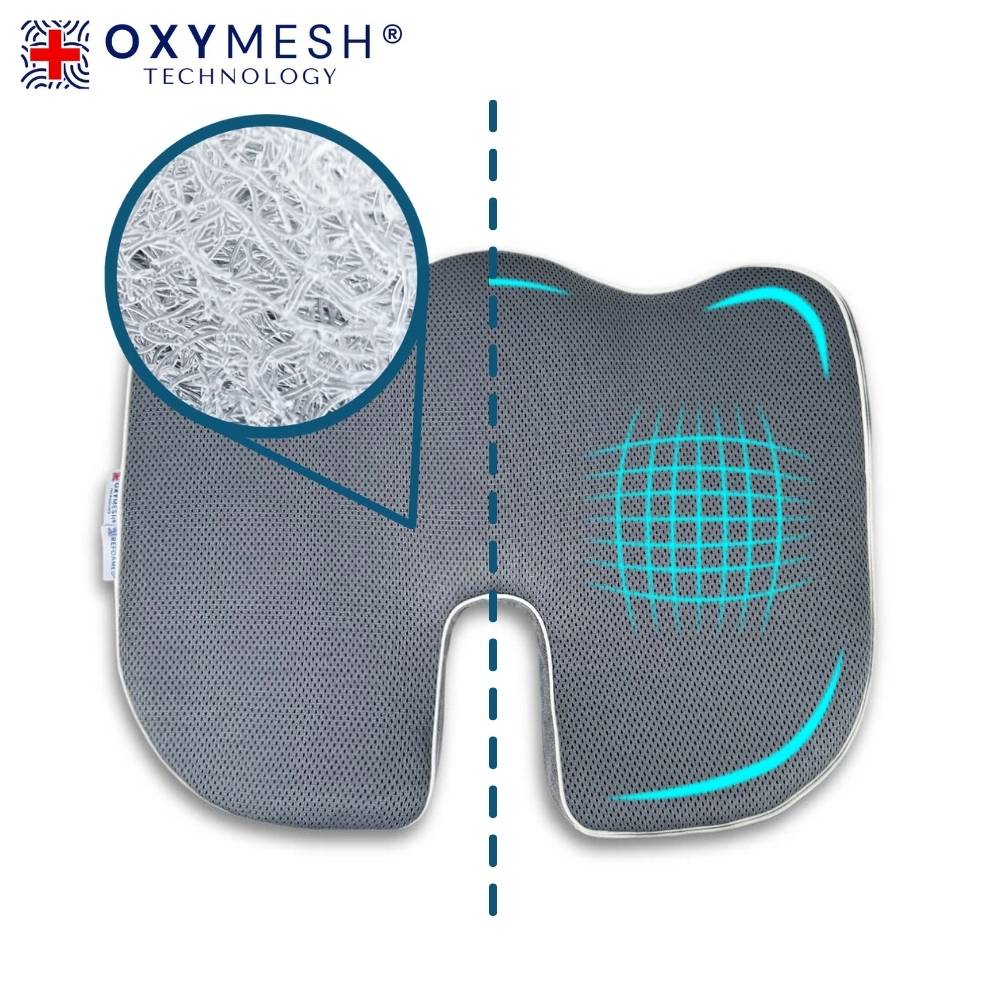 Oxymesh® zakt niet in zoals schuim – het is ademend en bestand tegen vervorming. Het ergonomische gat ontlast het stuitbeen en het geheel kan eenvoudig onder de douche worden gespoeld. Ideaal voor kantoor, auto en rolstoel.