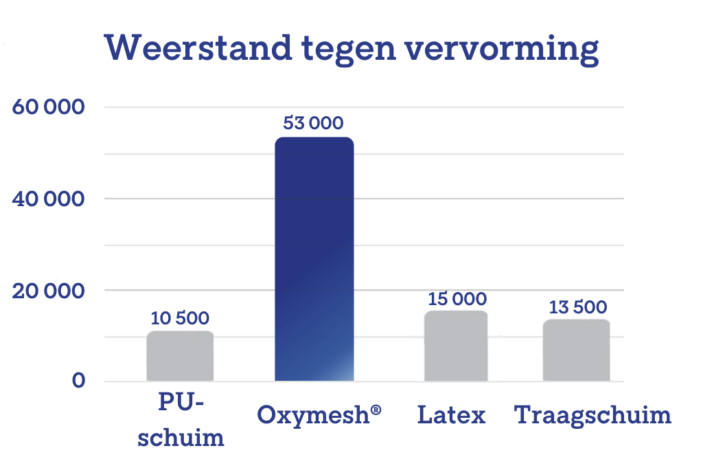In duurzaamheidstests behaalde Oxymesh® een indrukwekkend resultaat van 53.000 cycli voordat er ernstige vervorming optrad. Dat is maar liefst 5 keer meer dan standaard polyurethaanschuim (10.500 cycli) en bijna 4 keer meer dan memory foam (13.500 cycli).
