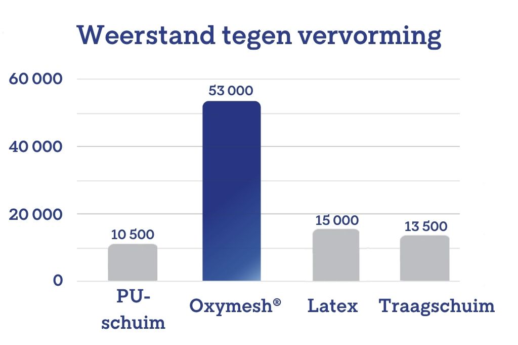Weerstand tegen vervorming is een van de belangrijkste eigenschappen van een matras dat jarenlang mee moet gaan. Laboratoriumtests toonden duidelijk aan dat Oxymesh® technologie traditionele materialen gebruikt in matrassen overtreft.